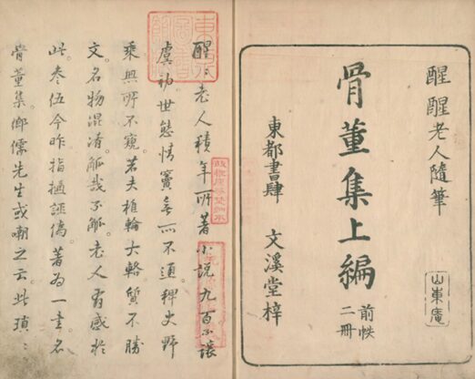 (京伝は)これよりまた、『骨董集』を書きたいと思い、苦心十余年に及んだ。その期間、書物をたくさん所有している人の家に赴き、珍しい書物を借りた。あるいは、博識の人に質問したり、あるいは、物知りの老人に聞いたりした。聞いたことは必ず書いて、(本を)読んだら必ず記録した。さらに、親しい人やよく知らない人など関係なく、しかじかの家に(目当ての本が)あると聞いたら、そこを訪問して(持ち主から)説明を聞いた。大方、他の蔵書を借りた場合、有用な箇所が書いているのは二、三巻に過ぎず、抜き出しすれば早く返却した。こうして、全書を読むことはないけれど、引用の書が多かった。心配りしながら、奔走するのは一朝一夕ではなかった。思うに、漢学は自分(京伝)が取り組むものではないし、国学は近来、著名な人物が多いので及ばない。ただ二百年来の風俗を考え極めた者はいない。自分(京伝)はこの趣味(※古書画や古器への興味)を持って成し遂げたら、儒者もまた貴重だと言い、国学者も感服するだろうともっぱら(風俗の)研究に苦心した。